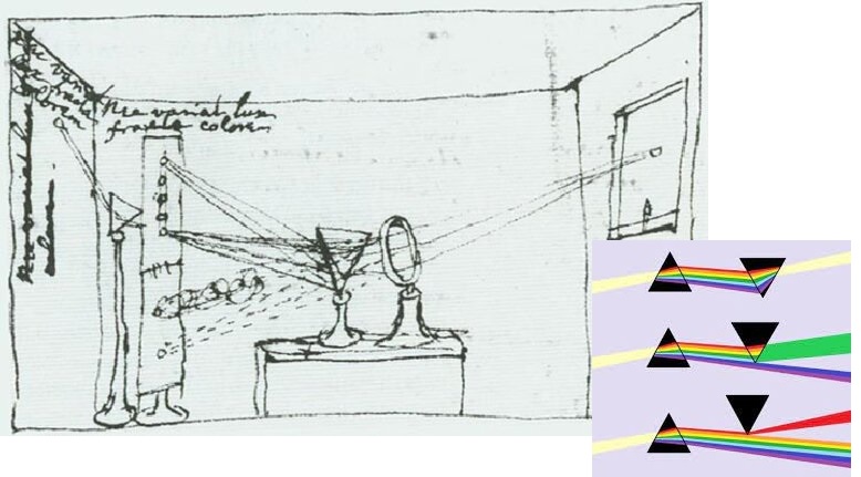 뉴턴은 빛을 작은 입자, 즉 '코르푸스클'로 이해했습니다. 이 입자들은 직선으로 움직이며, 다른 매질을 통과할 때 경로가 변한다고 보았습니다 . 아이작 뉴턴은 초기 경력부터 빛에 관심을 가졌으며, 그의 연구는 색에 대한 실험적 조사와 뉴턴 반사 망원경의 발명으로 과학계의 주목을 받았습니다. 그의 연구는 1672년에 출판되었지만, 빛의 작용 원리에 대한 이론을 제공하지는 못했습니다. 여러 이유로 뉴턴은 빛의 입자설을 선호했습니다. 이 이론은 빛이 직선으로 전파된다고 설명합니다. 그러나 뉴턴은 빛의 입자가 보이지 않는 에테르에 의해 영향을 받는다고 보았습니다. 뉴턴은 1704년에 그의 이론을 'Opticks'라는 책으로 출판하였습니다. 비록 이 실험이 주로 광학 연구와 관련이 있지만, 뉴턴은 빛의 성질을 연구하기 위해 프리즘 실험을 수행했습니다. 그는 백색광이 프리즘을 통과할 때 여러 색으로 분리되는 현상을 관찰했습니다. 이 실험은 뉴턴의 제1법칙, 즉 관성의 법칙과 연관이 있습니다. 이는 빛이 직선으로 이동하려는 성질과, 외부 힘(프리즘의 굴절력)에 의해 방향이 바뀌는 성질을 보여줍니다.