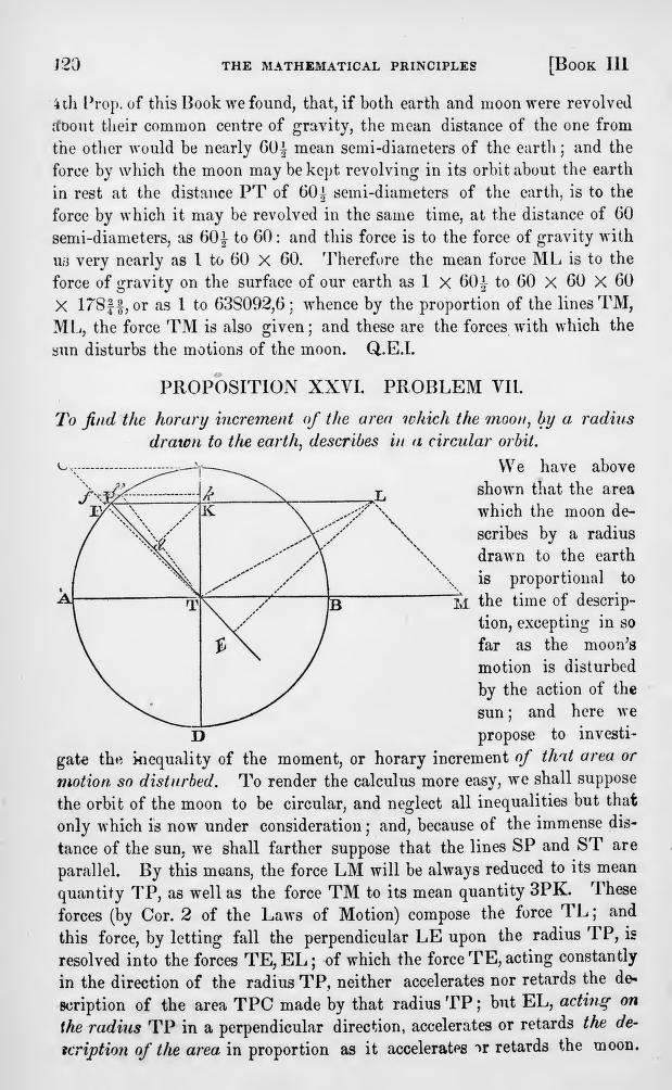 제3장: 달의 운동 (Proposition 3, Theorem 3): 뉴턴은 만유인력 법칙을 통해 달이 지구 주위를 도는 궤도를 설명합니다. 그는 달과 지구 사이의 인력이 달의 궤도에 미치는 영향을 분석합니다.