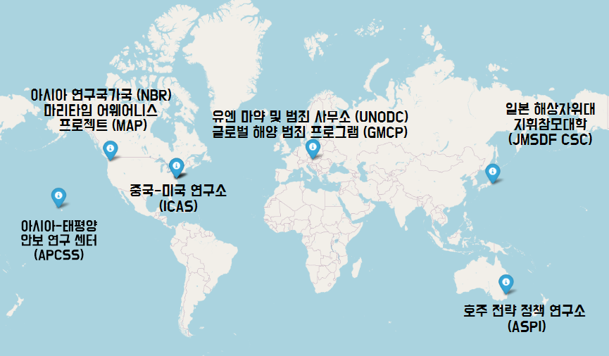 - 마리타임 어웨어니스 프로젝트 (MAP) - 아시아 연구국가국 (NBR): MAP는 세계적인 해양 전문가들의 엄격한 분석과 인터랙티브 지도를 결합하여 해양 문제에 대한 권위 있는 자료를 제공합니다. 아시아-태평양 지역의 해양 안보 문제를 탐구하며 경제적 및 안보적 이해관계를 폭넓게 이해할 수 있도록 돕습니다.