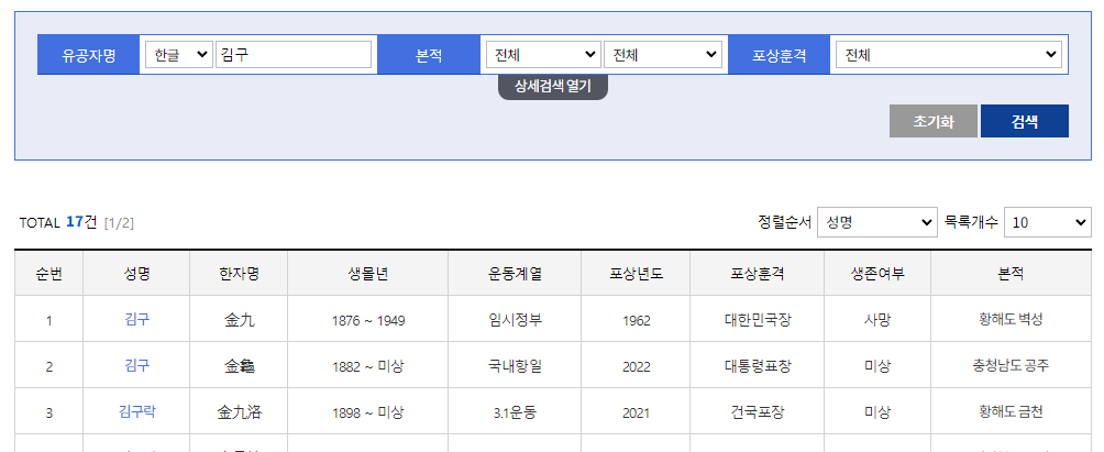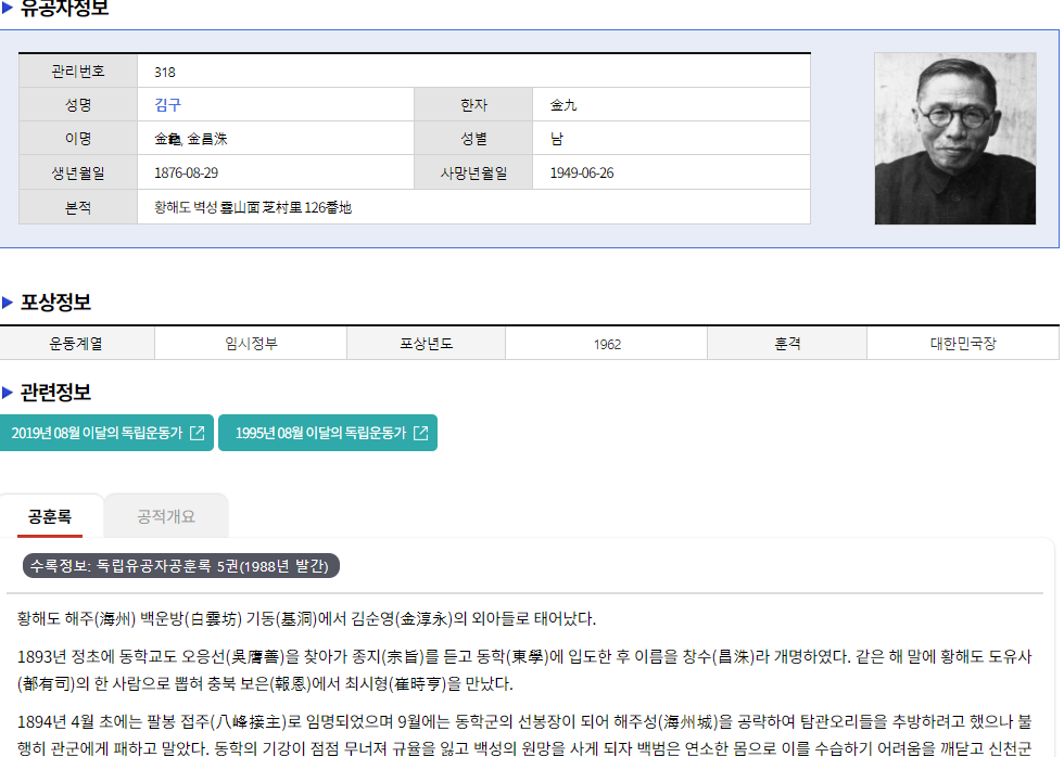 독립유공자 찾기에서 우리가 아는 분들인 김구, 유관순, 안중근, 윤봉길님 등의 이름만 치시면 그 분들의 공적을 아주 상세히 보실 수 있습니다.