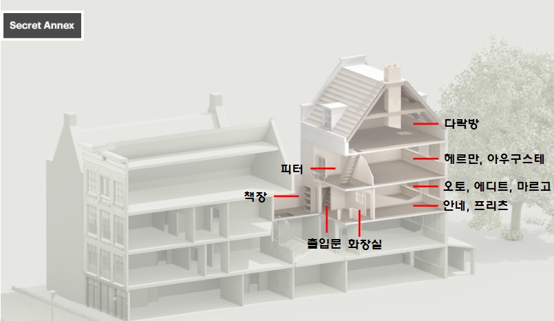 아래 그림은 은신처에서 거주하였던 배치입니다(출처: 안네의 박물관)