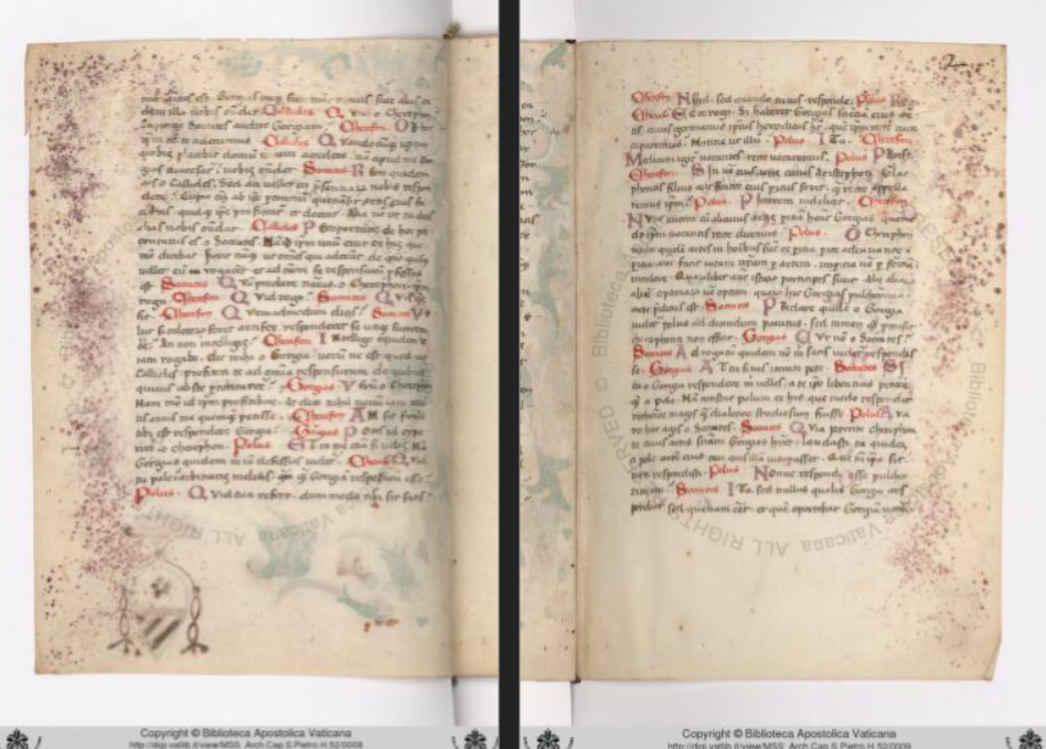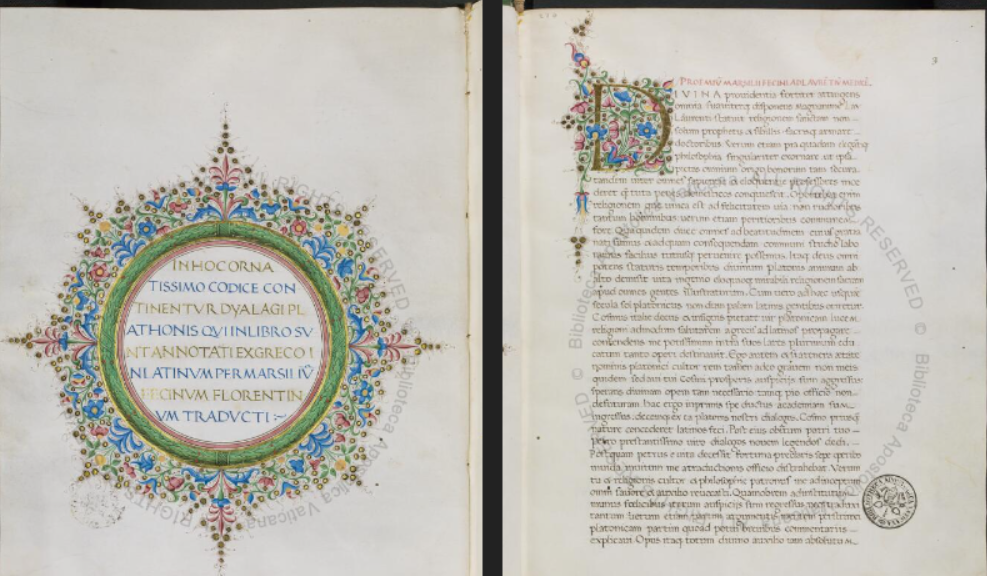 플라톤의 작품 "테아이테토스"가 마르실리오 피치노에 의해 그리스어에서 라틴어로 번역된 책, 피렌체의 메디치 가문을 위해 제작되었음(출처: 바티칸 도서관 디지털 아카이브, 겸식어: Theaetetus) |