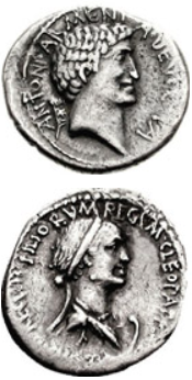 클레오파트라의 동전은 그녀의 실제 외모와 통치 시기를 보여주는 중요한 유물입니다. 동전의 앞면에는 마크 안토니의 머리가, 뒷면에는 클레오파트라의 흉상이 새겨져 있습니다. 이는 그녀가 지성과 매력으로 통치했음을 상징합니다. 동전의 글귀 "ANTONI·ARMENIA·DEVICTA"는 마크 안토니의 아르메니아 정복을, "CLEOPATRAE·REGINAE·REGVM·FILIORUM·REGVM"은 클레오파트라가 왕들의 여왕이자 왕들의 자녀의 여왕임을 나타냅니다. (출처: Macquaire University) |