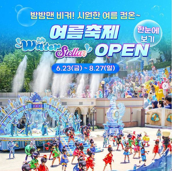 | 설명 | 여름축제 기간 동안 에버랜드는 맑고 시원한 물이 샘솟는 신비한 물의 행성 '워터 스텔라'로 변신해 고객들에게 더위를 날려 버리는 물 맞는 재미와 체험 콘텐츠를 시원하게 선사한다. 특히 에버랜드의 밤하늘을 환상적으로 수놓는 멀티미디어 불꽃쇼가 새롭게 펼쳐지고, 청량한 여름 테마정원과 쿨쉘터까지 다채롭게 선보이는 등 올 여름 에버랜드는 낮과 밤 모두 즐길 거리가 가득하다. |