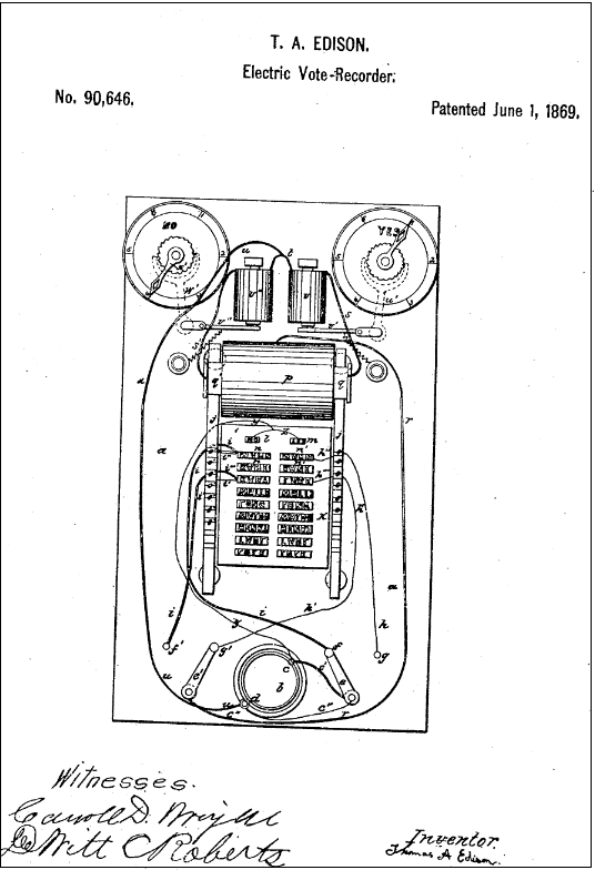에디슨은 1869년 6월 1일에 이 발명품으로 미국 특허 90,646호를 취득했습니다. 동료 전신기사인 듀이트 로버츠(Dewitt Roberts)는 이 발명품의 지분을 100달러에 사서 워싱턴 DC로 가져가 의회 위원회에 전시했습니다. 그러나 위원회는 이 발명품이 투표를 기록하는 속도에 만족하지 못했습니다. 한 위원은 로버츠에게 "우리가 지구상에서 원하지 않는 발명품이 있다면 바로 그것이다"라고 말했습니다. 이는 의회와 기타 입법부에서 출석 투표가 느린 속도로 진행되어 의원들이 입법을 방해하거나 다른 의원들을 설득할 시간을 제공했기 때문입니다.