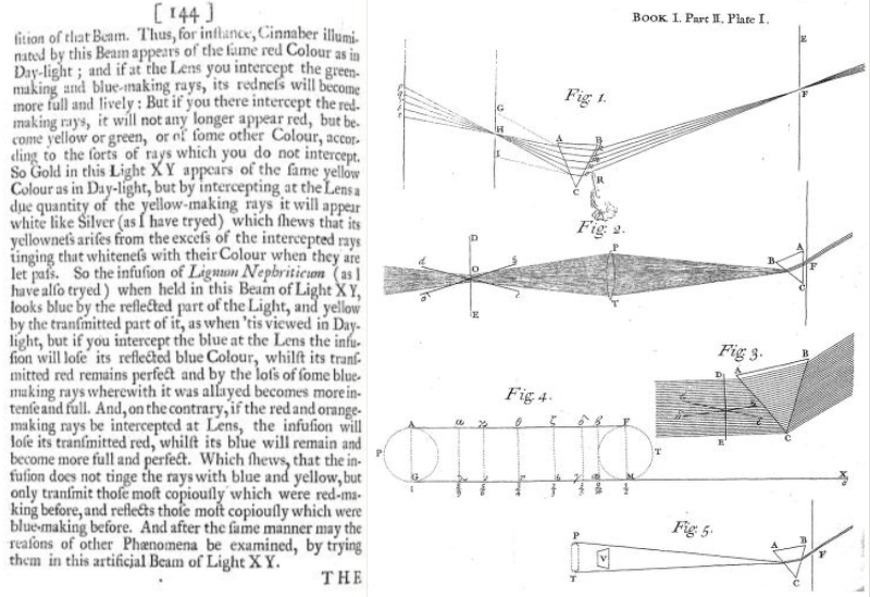 뉴턴의 "Opticks"에서 발췌된 것으로, 뉴턴의 프리즘 실험과 관련된 그림 및 설명이 포함되어 있습니다. 여기에는 빛의 분산과 색의 본질에 대한 뉴턴의 연구 내용이 포함되어 있습니다. 뉴턴의 광학 실험과 관련된 여러 가지 그림이 포함되어 있으며 내용은 아래와 같습니다.