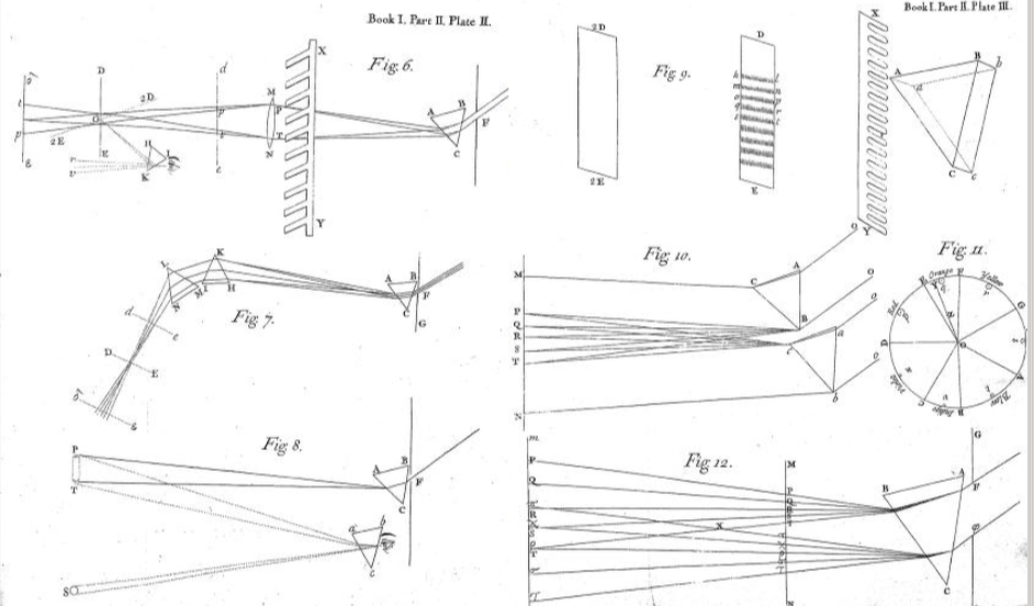 이 이미지는 아이작 뉴턴의 광학 연구에서 나온 다양한 실험 장치와 빛의 경로를 설명하는 도면들입니다. 각 그림은 빛의 성질과 관련된 실험적 설정을 보여줍니다.