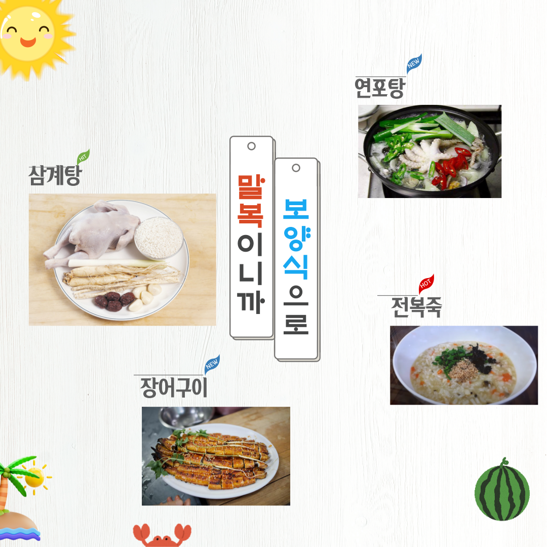 음양오행의 관점에서, 복날에는 몸의 양기를 보충하고, 음양의 균형을 맞추는 것이 중요합니다. 따라서 복날에는 다음과 같은 보양식이 추천됩니다.
