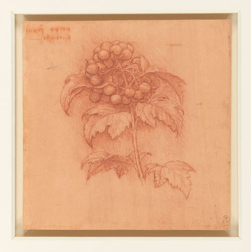 우측 스케치는 열매가 guelder-rose(Viburnum opulus L.) 가지로 잎이 말려 처져 있는 모습이 나와 있는데, 레오나르도는 잎의 윤곽선 모양뿐만 아니라 자연스러운 성장과 중력의 힘에 노출되었을 때의 살아있는 모습에도 관심이 있었기 때문입니다. 그는 15세기 이탈리아 미술의 자연스러운 세부 묘사의 전통을 따라 평생 식물과 꽃을 그렸습니다. 그의 가장 훌륭한 식물 그림은 위의 레다와 백조(Leda and the swan)의 그림의 전경과 그린 것과 관련하여 만들어졌습니다 .