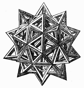 ⊙ 두 번째 이미지: 이 이미지는 복잡한 별 형태의 다면체를 보여줍니다. 이러한 형태는 레오나르도의 기하학적 탐구에서 자주 나타나는 요소로, 특히 플라톤의 입체와 관련된 연구를 반영하고 있습니다. 이 다면체는 많은 삼각형이 모여서 형성된 구조로, 기하학적 아름다움과 수학적 정밀함을 동시에 나타냅니다.
