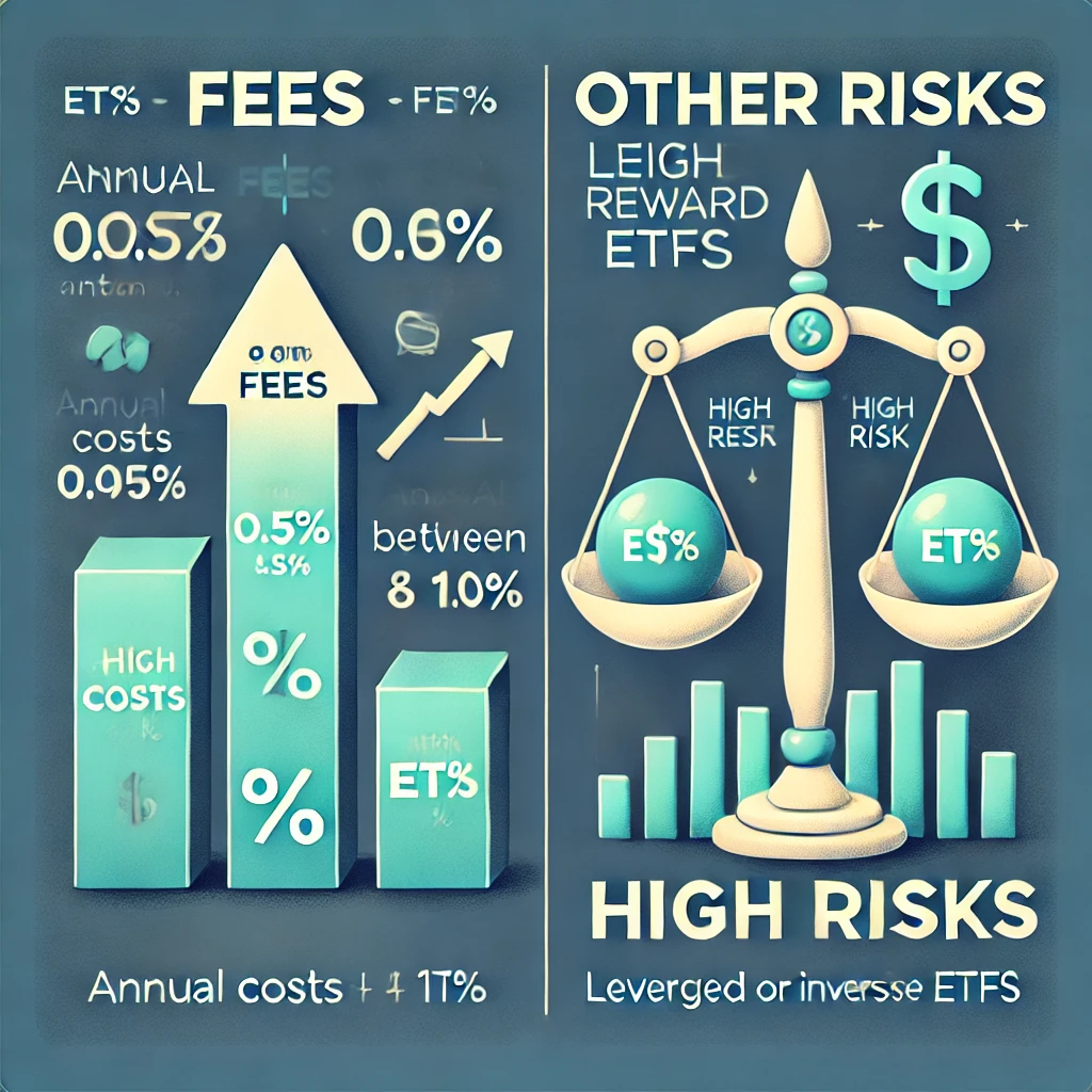 - 수수료: ETF는 펀드 관리 비용이 포함되어 있어, 개별 종목에 투자하는 것보다 상대적으로 수수료가 높을 수 있습니다. 일반적으로 연간 0.05%에서 1% 사이의 수수료가 발생합니다.