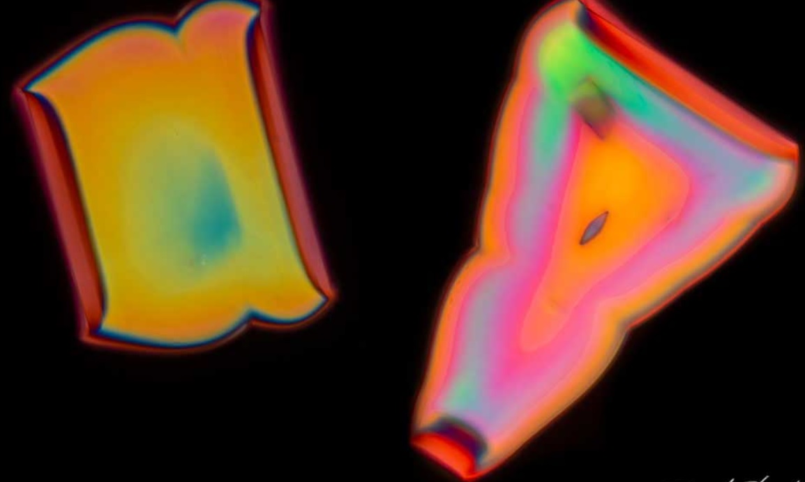 위에서 그림 1과 그림 4에 표시된 결정은 파스퇴르의 원본 간행물 중 하나에서 가져온 것으로 아래쪽 두 결정은 이 두 가지 결정 구성을 현대적으로 표현한 것입니다. 아래 사진은 파스퇴르가 보았을 타르타르 결정의 편광된 빛입니다.