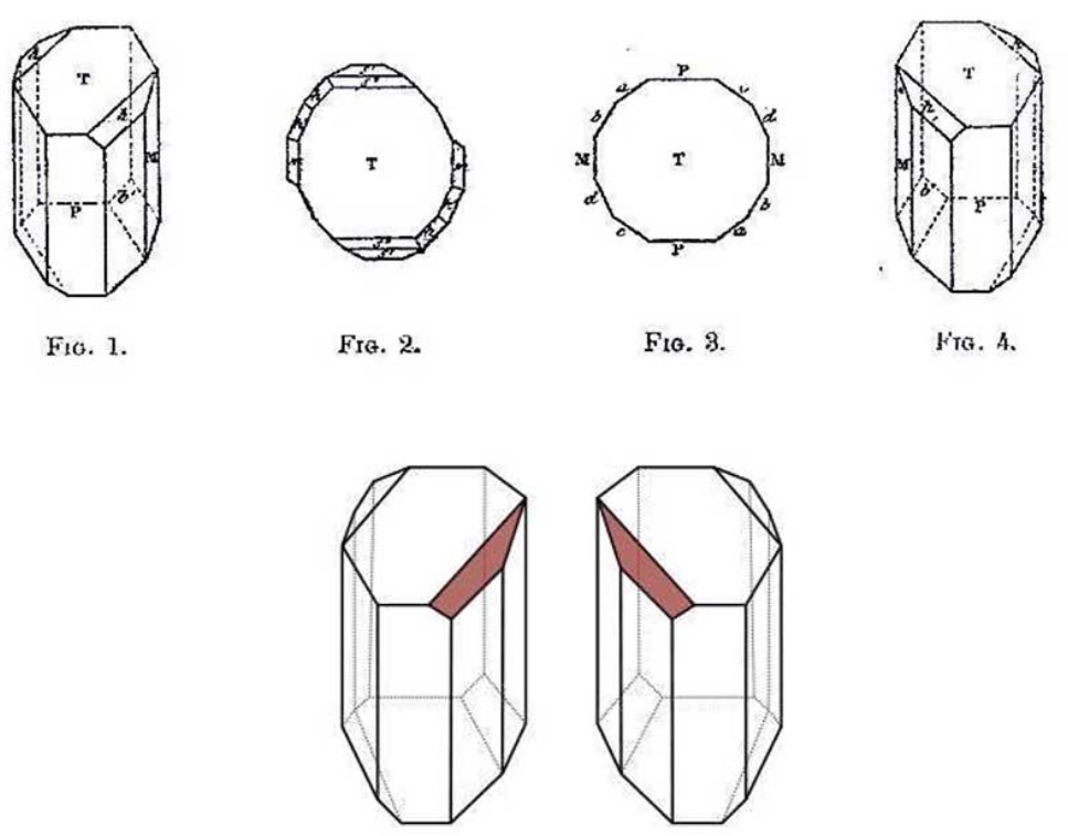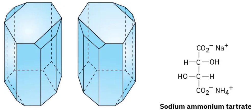 주석산 수용액을 편광을 비추면 편광이 용액을 통과하려면 편광판을 약간 오른쪽으로 회전해야 합니다. 편광이란 전자기파인 빛의 전기장이 한쪽 방향으로만 진동하는 특성입니다. 특이하게도 인공으로 만든 주석산 용액에서는 편광 현상이 관찰되지 않았습니다. 이에 천연 주석산의 구조와 편광을 알고 있었던 파스퇴르는 자연산 주석산과 인공 주석산의 결정구조를 분석하기 위해 인공 결정에서 서로 다른 두 결정체를 연구하였습니다. 파스퇴르는 두 종류의 결정이 서로 거울상에 해당하는 대칭 형태를 가지고 있음을 현미경으로 확인하고(오늘날의 이해하는 거울상 이성질체(mirror-image isomers)하였다. 인공 결정은 두 종류의 결정체가 섞여 있었기 때문에 핀셋을 사용하여 수작업으로 이 두 유형의 결정을 하나씩 분리하였습니다. 천연 주석산 결정에서 볼 수 없었던 거울상 결정인 분리된 결정을 분리하여 수용액에 넣어 관찰한 결과 정반대의 편광회전을 보이는, 즉 편광을 왼쪽으로 회전시키는 것으로 알아냈습니다.