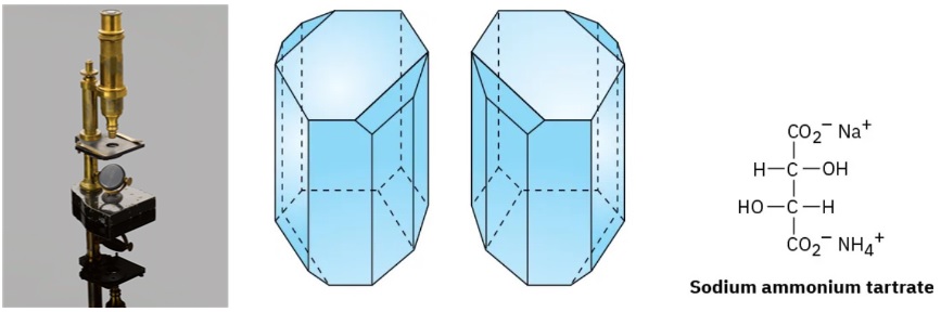 분리한 두 종류의 결정을 각각 물에 녹여 그 용액의 광학 활성을 시험하였는데 각 용액이 편광된 빛을 서로 반대 방향으로 회전시키는 것을 알아 냈습니다. 이것은 두 이성질체가 광학적으로 활성이 있으며, 서로 반대의 광학 활성을 가지고 있음을 증명했습니다. 위 그림에서 두 결정 사이에 마치 거울이 있어 마주하듯 보이는 형상입니다. 빛을 시계방향으로 회전시키면 오른손 분자, D 거울상 이성질체라고 부르고, 반시계방향으로 회전시키면 왼손 분자, L 거울상 이성질체로 정의합니다. 이것은 편광현미경과 편광계를 사용하여 검증하였는데 편광현미경은 물질이 편광된 빛을 어떻게 회전시키는지 관찰하는 장비로서 같이 부착된 편광계로 편광의 회전 각도를 정확하게 측정합니다.