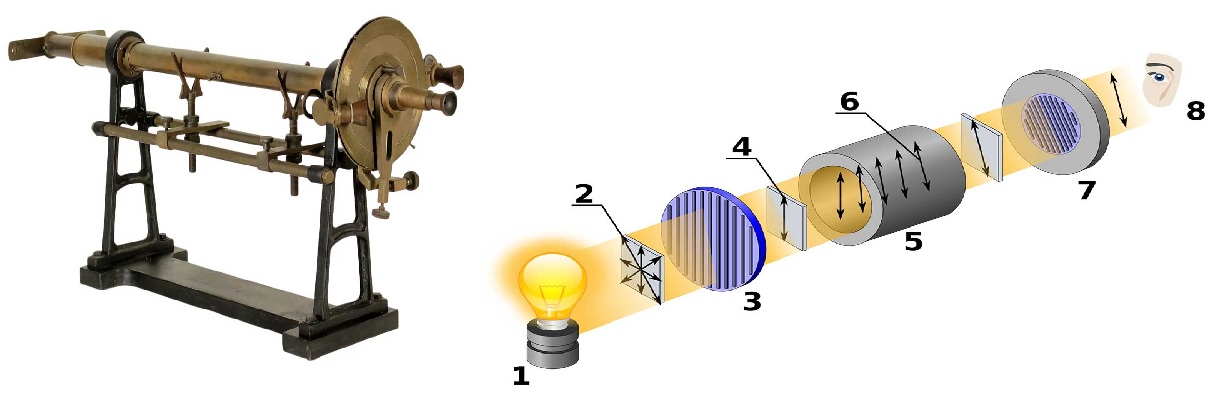 위의 사진과 그림은 당시 사용했을 편광계와 유사한 장비와 장비의 작동 원리를 보여주는 그림입니다. 1의 광원에서 편광되지 않은 빛을 쪼이면 5번의 샘플 튜브에 넣은 용액 속 시료를 통과한 후 6번의 편광 필터를 통과합니다. 편광의 회전 정도는 이 편광 필터의 회전에 의해 결정됩니다. 각 구성품은 1. 광원 2. 편광되지 않은 빛 3. 선형 편광판 4. 선형 편광 5. 샘플 튜브 6. 분자에 의한 광학 회전 7. 회전 가능한 선형 분석기 8. 검출기입니다.