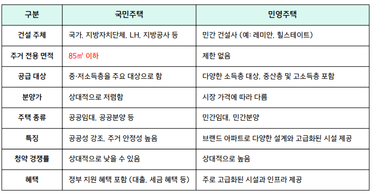 주택청약을 제대로 이해하기 위해서는 먼저 주택의 종류에 대한 기본 개념부터 잡아야 합니다. 우리나라 주택은 크게 국민주택과 민영주택으로 나뉘는데요, 이 둘의 차이를 명확히 이해하는 것이 중요합니다. 다음은 국민주택과 민영주택의 차이점을 아래 표로 정리했습니다. 입주대상과 가점제과 같은 제한 사항도 있습니다. 별도의 소제목으로 정리하였습니다.