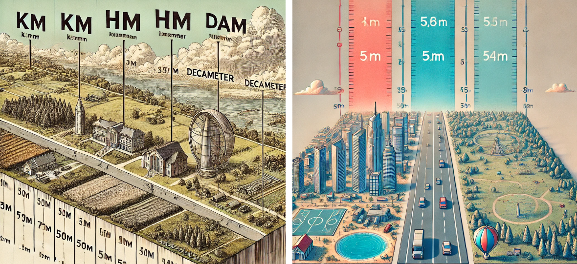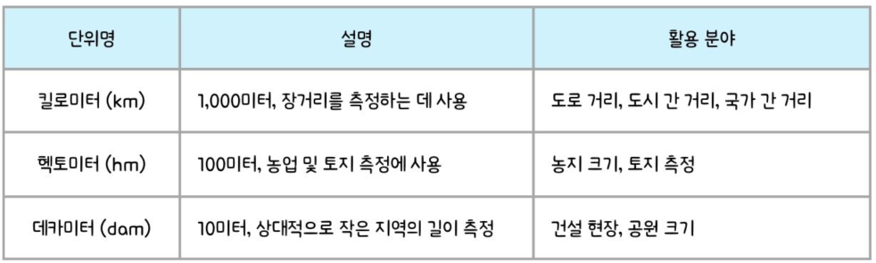 | 대단위 | 킬로미터, 헥토미터, 데카미터 | 도로, 토지, 대규모 인프라 |