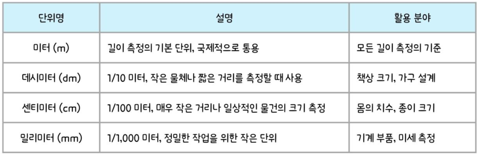 | 일반단위 | 미터, 데시미터, 센티미터, 밀리미터 | 건축, 가구 설계, 일상 물품 |