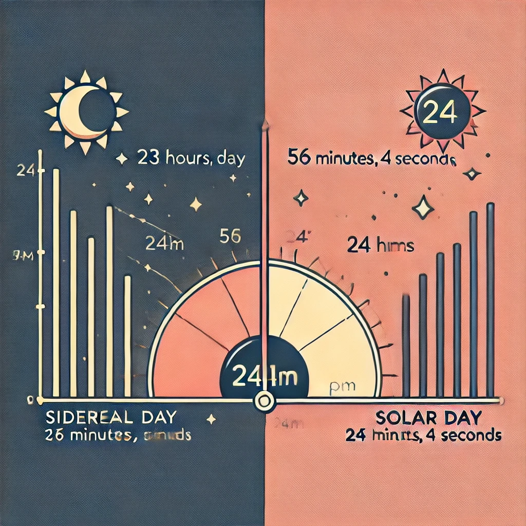 - 태양일(24시간)보다 짧은 이유는 지구가 자전하는 동안 태양은 이동하는데, 항성은 상대적으로 고정된 위치에 있기 때문에 지구가 태양을 기준으로 한 바퀴 자전하는 것보다 항성 기준으로 자전하는 시간이 더 짧습니다.