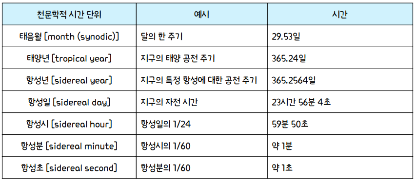 항성일(Sidereal Day), 항성시(Sidereal Hour), 항성분(Sidereal Minute), 항성초(Sidereal Second)에 대한 설명입니다.
