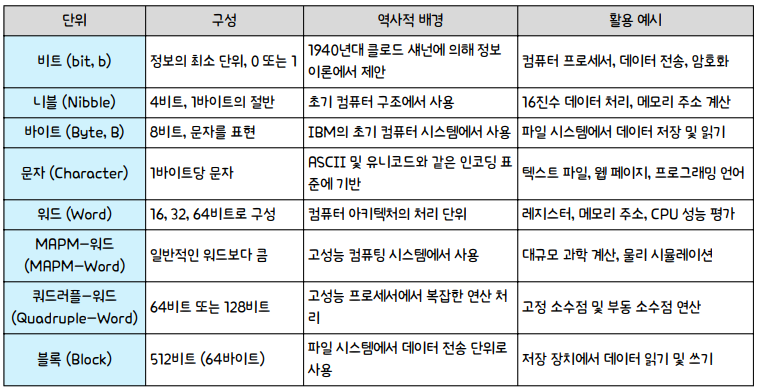 이와 같은 다양한 데이터 크기 단위들은 현대의 컴퓨팅 시스템에서 효율적인 데이터 처리와 전송을 위해 필수적으로 사용되며, 각각의 단위는 컴퓨터 아키텍처와 데이터 구조의 발전에 중요한 역할을 하고 있습니다. 다음은 내용을 요약한 표입니다.