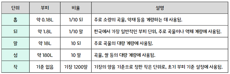 ※ 위 기준은 조선 초기 세종대왕 시절에 황종관(黃鍾管)을 기반으로 정리된 부피 단위 체계에서 비롯됩니다. 이 체계는 당시 농업 중심 사회에서 곡물의 생산량을 정확히 측정하고 세금 징수의 공정성을 확보하기 위해 법제화되었습니다. 특히, 기장 1,200알이라는 구체적인 측정 방식과 "작(勺)"을 기준으로 하는 단위 체계는 당시의 표준화된 측량 방식에서 나온 것입니다.