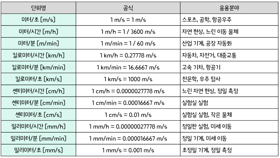 미터/초, 미터/분, 미터/시, 킬로미터/초, 킬로미터/분, 킬로미터/시, 센티미터/초, 센티미터/분, 센티미터/시, 밀리미터/초, 밀리미터/분, 밀리미터/시, 속도 단위 완벽 가이드