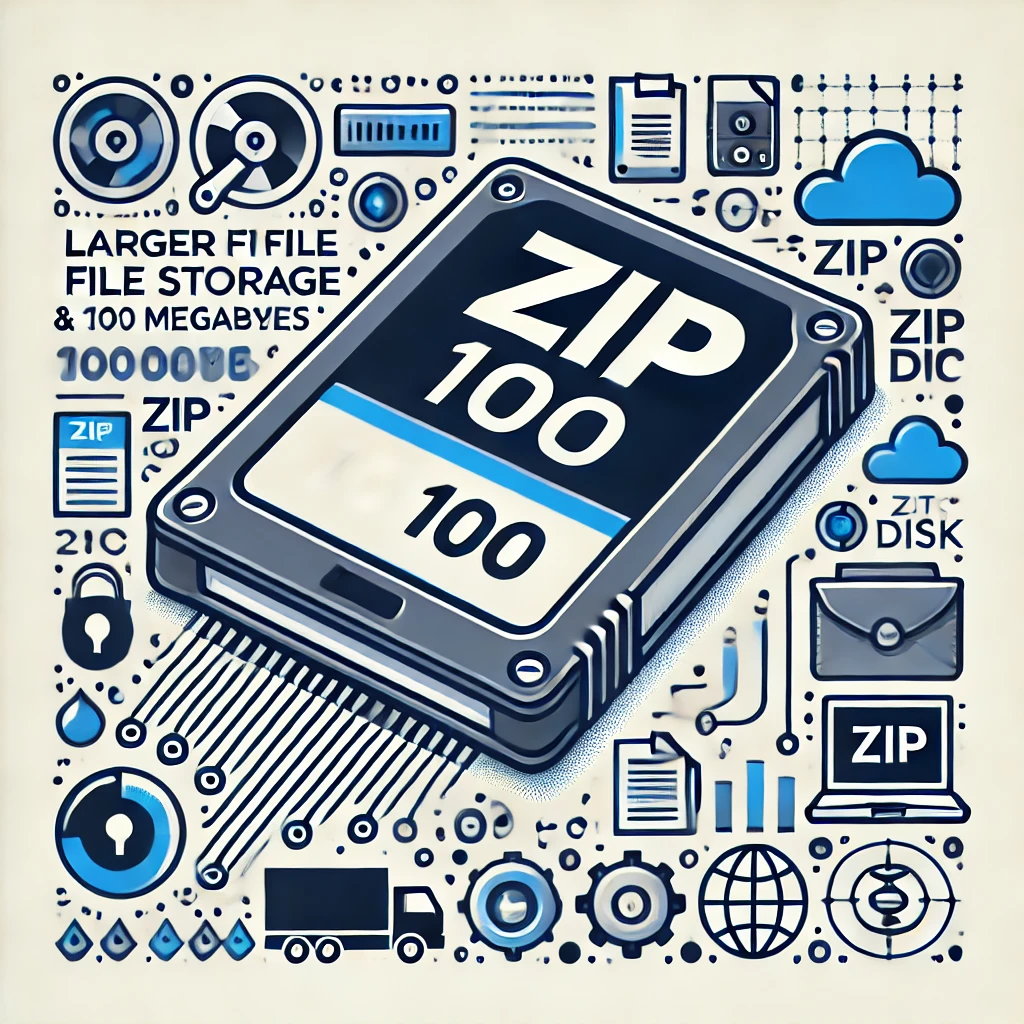 Zip 100은 100메가바이트의 데이터를 저장할 수 있는 이동식 디스크입니다. Zip 드라이브는 1990년대 중반에 개발되어 널리 사용되었으며, 당시로서는 매우 큰 용량을 제공하여 문서, 이미지 파일, 소규모 데이터 백업 등에 적합했습니다. Zip 디스크는 주로 개인 사용자와 소규모 비즈니스에서 사용되었으며, 플로피 디스크보다 훨씬 빠른 전송 속도를 자랑했습니다.