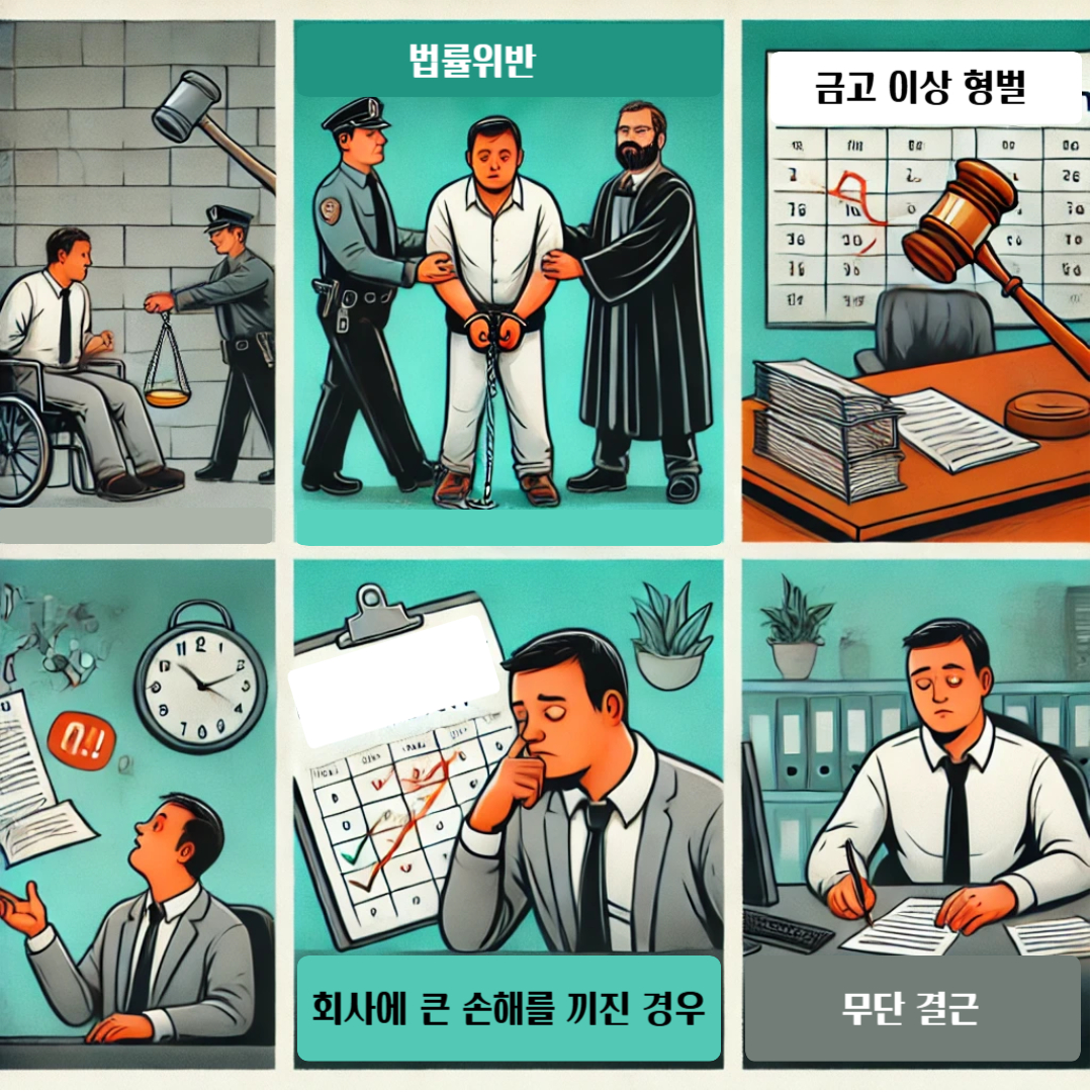 근로자가 정당한 사유 없이 장기 무단결근을 하거나, 근로계약서 또는 취업규칙에 명시된 규정을 반복적으로 위반한 경우에도 실업급여를 받을 수 없습니다. 이는 근로자가 본인의 직무를 성실히 수행하지 않고, 스스로 퇴사를 유발한 것으로 간주됩니다.