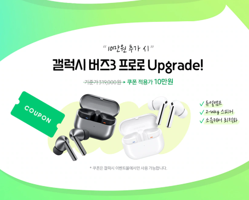 혜택1: Galaxy Z Fold6, Z Flip6, S24 시리즈 구매 시 갤럭시 버즈3 무상 증정 또는 10만 원 추가 시 갤럭시 버즈3 프로 업그레이드 혜택 제공