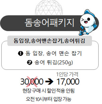 † 정원: 200명 † 소요시간: 약 180분 † 체험기간: 당일 † 체험시기: 2024-11-23 ~ 2025-03-03 † 돔송어Ⅰ 기본(Ds1): 17,000원 † 돔송어Ⅰ 수미2(DsS2): 31,000원 † 돔송어Ⅰ 수미2 추가 옵션(DsS2): 38,000원 † 준비물: 활동복, 여벌옷, 수건 등 개인용품 |