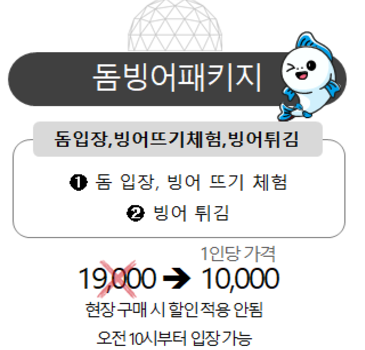 † 정원: 500명 † 소요시간: 정보 없음 † 체험기간: 당일 † 체험시기: 2024-11-23 ~ 2025-03-03 † 돔빙어Ⅱ(Db1): 10,000원 † 돔빙어Ⅱ 수미2(DbS2): 24,000원 † 돔빙어Ⅱ 수미3(DbS3): 31,000원 † 준비물: 방한복, 장갑, 수건, 갈아입을 옷 |