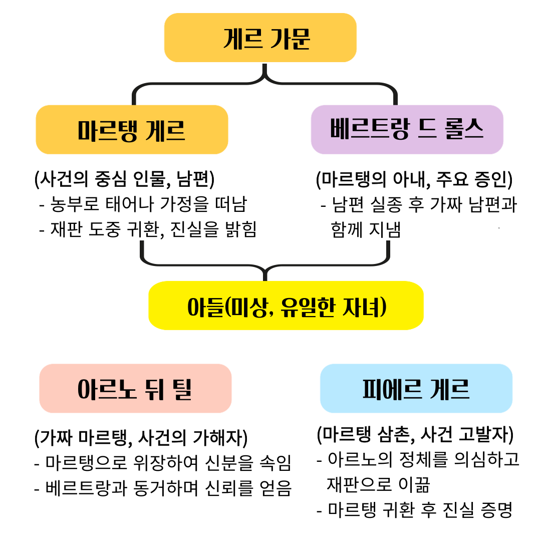 - 베르트랑 드 롤스 (Bertrande de Rols): 마르탱 게르의 아내로, 사건의 주요 증인이자 중심 인물. 그녀는 남편이 돌아왔다는 남자의 진술을 처음에는 받아들였지만, 이후 그의 정체에 의문을 품었습니다.