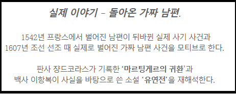 이 작품은 프랑스의 마르탱 게르 사건(1542)과 조선 선조 때 가짜 남편 사건(1607)을 모티브로 삼아, 법학자 쟝 드 코라스가 기록한 『마르탱 게르의 귀환』과, 조선의 문인 백사 이항복이 남긴 『유연전』을 재해석하여 탄생했다. 하지만 이것은 단순한 재현이 아니다. 이 작품은 당시의 사건을 넘어선 상상과 인간 본성의 탐구로, 시대와 장소를 초월하는 이야기를 펼쳐 보이는 작가의 모티브를 이해할 수 있은 이야기이다. 특이하게도 두 분은 동시대를 살았다는 점입니다.