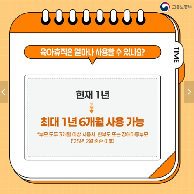 ■ 맞벌이 부부의 육아휴직 기간 확대: 부모가 각각 육아휴직을 3개월 이상 사용하는 경우, 기존 1년에서 1년 6개월로 연장하여 사용할 수 있습니다.