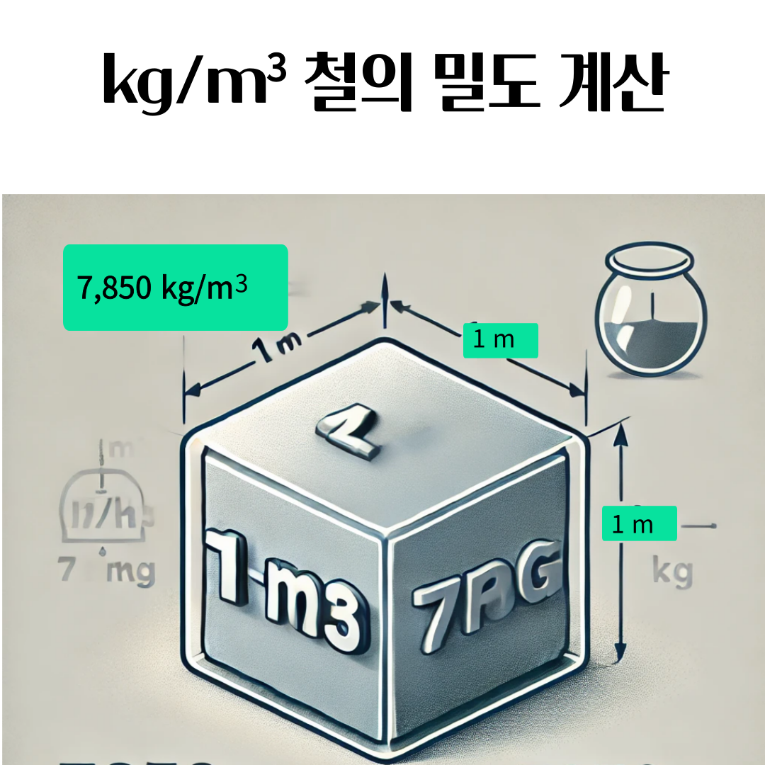 따라서 철의 밀도는 \(7850 \; \text{kg/m³}\)로 계산됩니다. 이 값은 순수한 철의 밀도를 나타냅니다.