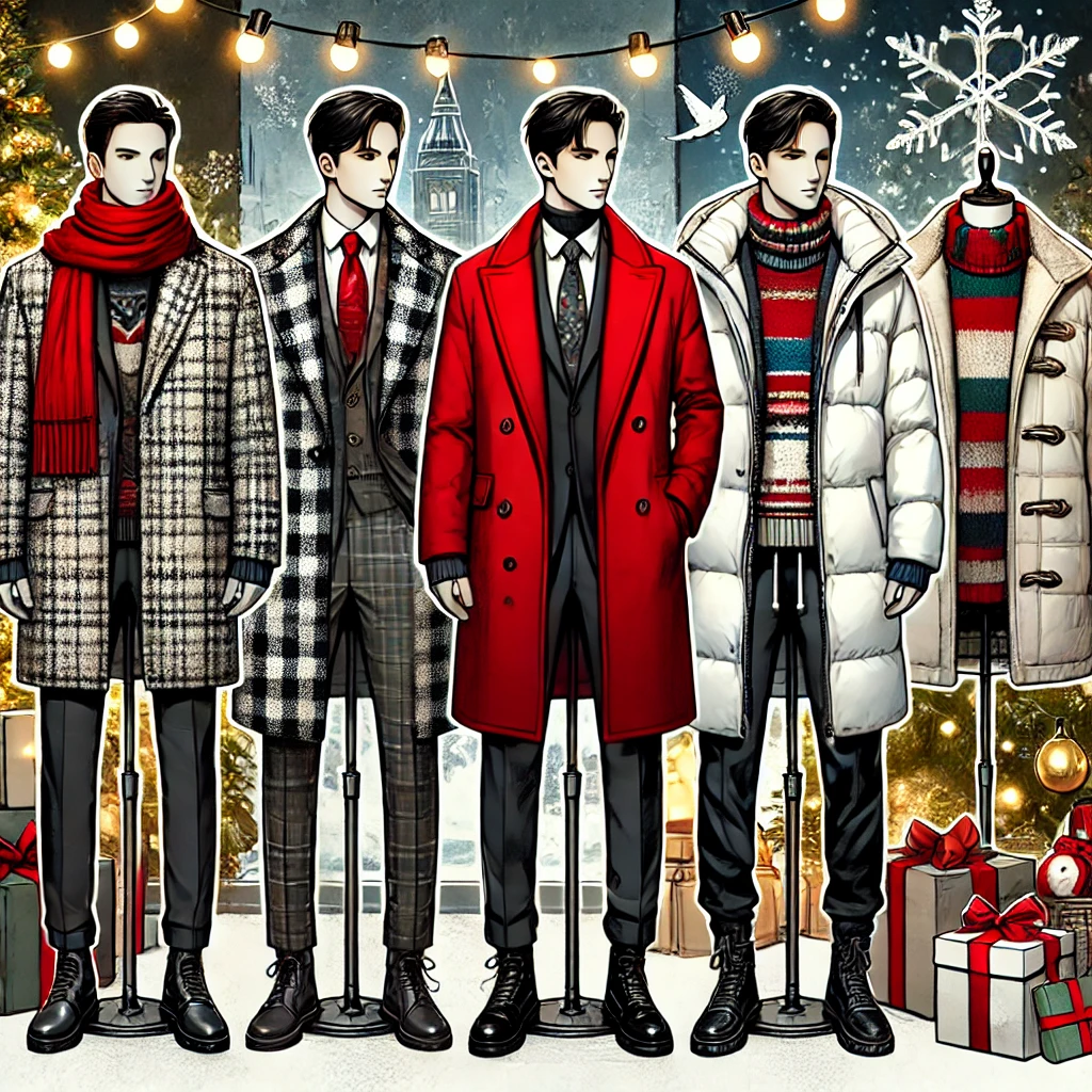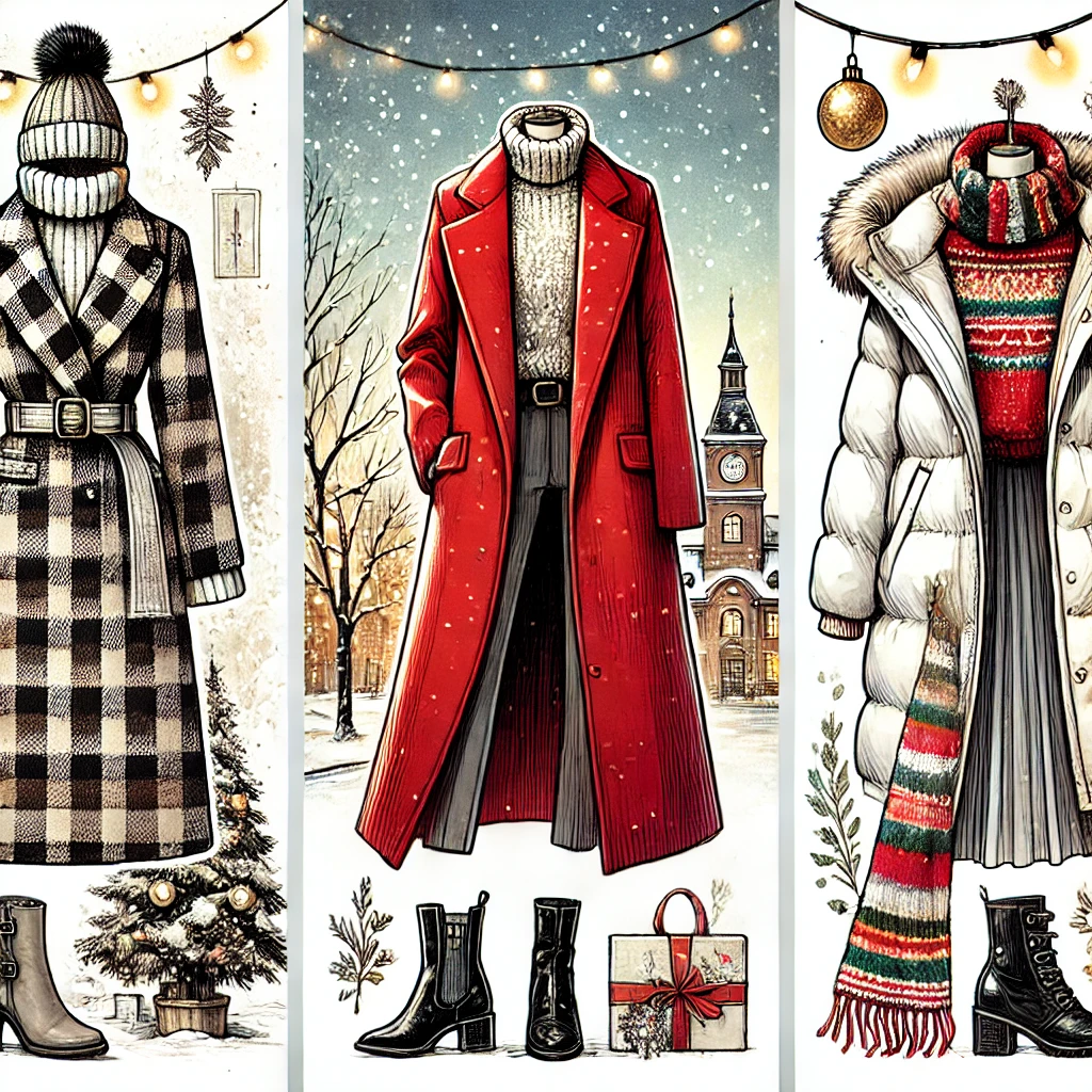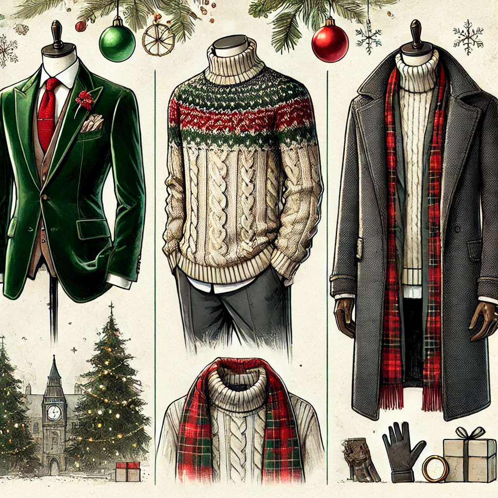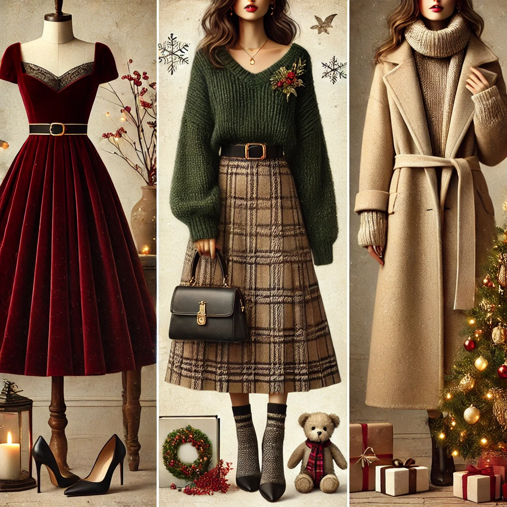 - 벨벳, 니트, 체크 패턴: 겨울의 따뜻함을 전달하면서도 크리스마스 시즌과 어울리는 소재와 패턴입니다.