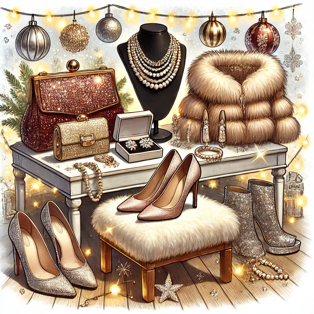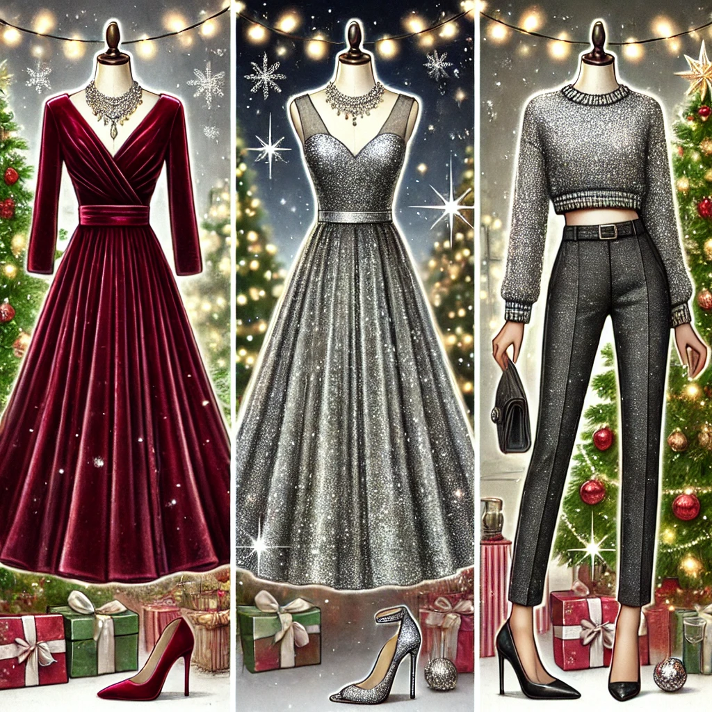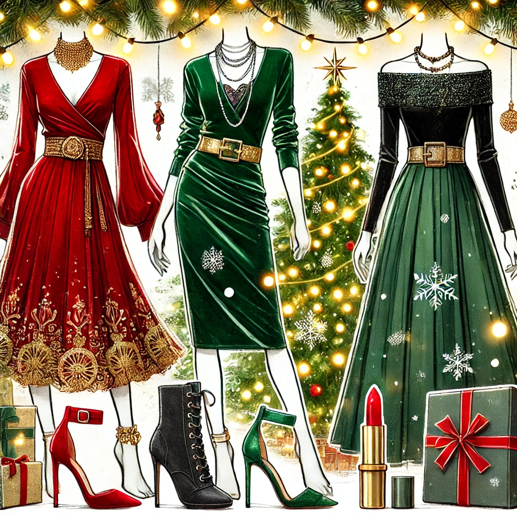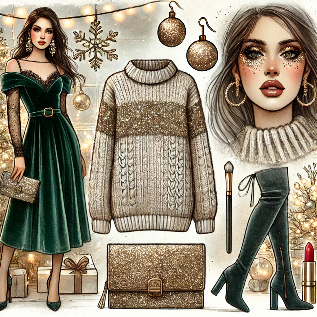- 벨벳 원피스, 글리터 액세서리: 매년 크리스마스 시즌의 파티룩으로 꾸준히 사랑받는 트렌디한 아이템입니다.