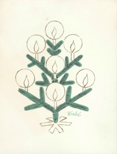 또한, 앤디 워홀은 크리스마스 카드를 제작하며 팝아트로 크리스마스를 재해석했습니다. 1956년에 제작한 티파니 앤 코.(Tiffany & Co.) 크리스마스 카드입니다. 아래는 크리스마스 트리를 상징하는 도식적인 디자인이 중심입니다. 촛불 모양이 트리의 가지 위에 배치되어 있으며, 단순하면서도 세련된 구성이 돋보입니다.