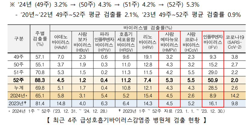 - 질병관리청에 따르면, 국내 HMPV 검출률은 49주 3.2%에서 52주 5.3%로 소폭 증가했으나, 이는 평년 수준입니다.