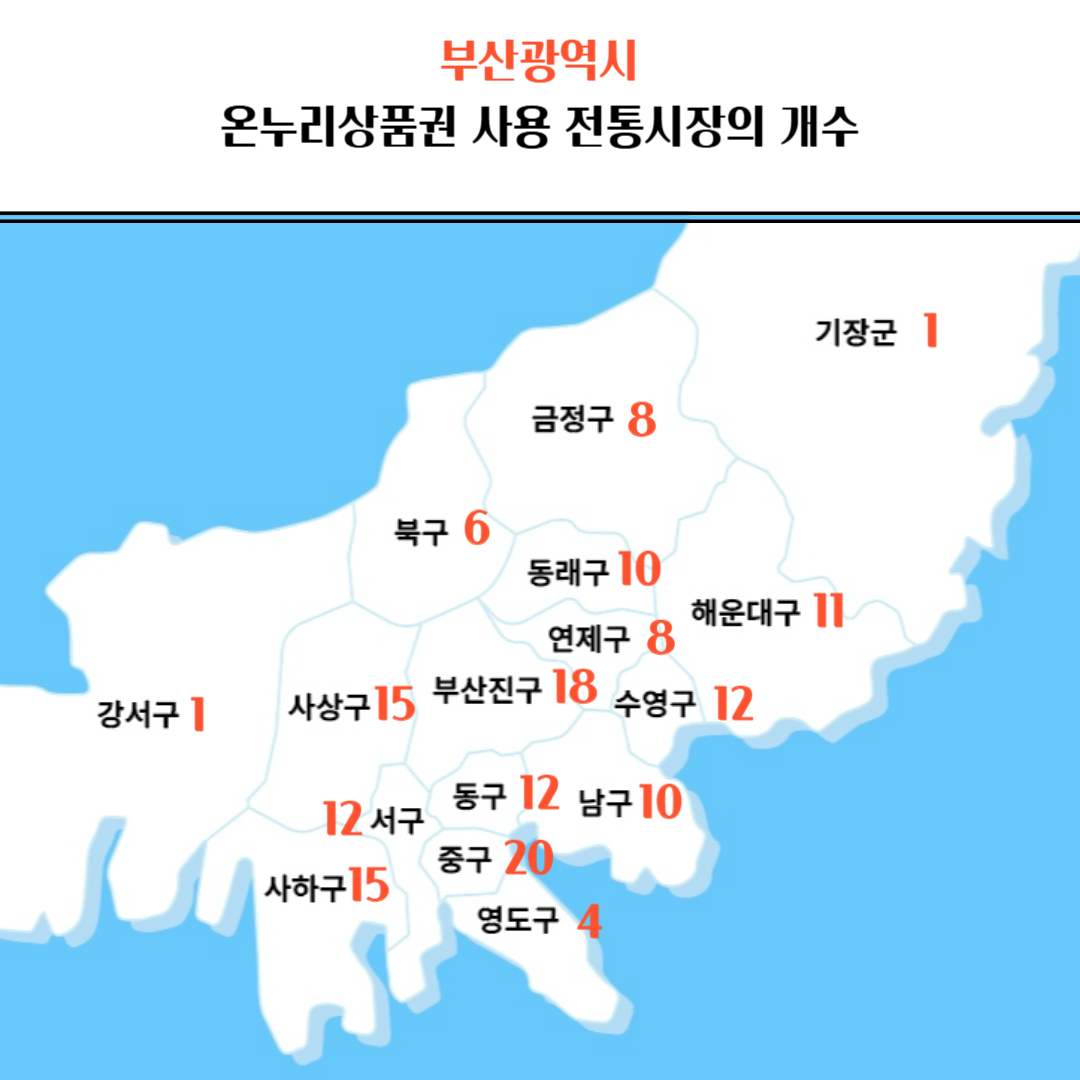 | 동구 (12) | 수정시장, 부산자유시장, 초량상가시장, 부산남문시장, 부산진시장, 수정전통시장, 초량전통시장, 성북시장, 범일골목시장, 부산좌천동가구상가, 부산역지하도상가 |