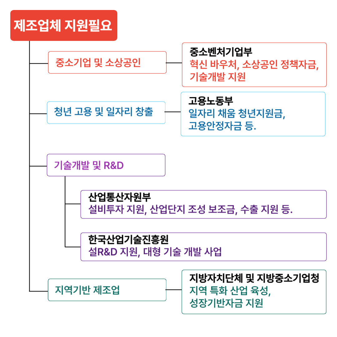 | 지방자치단체 및 지방중소기업청 | 지역 특화 산업 육성, 성장기반자금 지원 | 지역 기반 제조업체 |
