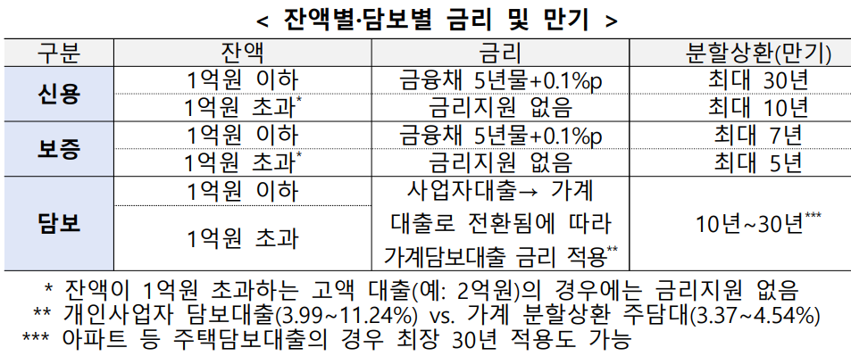 - 개인 사업자는 최대 5000만 원, 법인 소상공인은 최대 1억 원까지 지원.