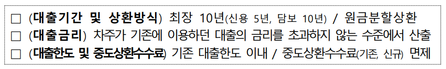 - 대출금 일시 상환 부담을 덜기 위해 저금리 대출과 분할 상환 지원.