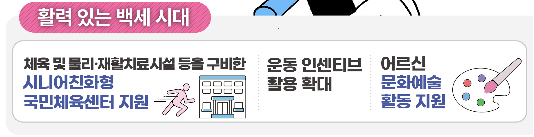 2) 시니어 체육 센터: 전국 8개 시니어 친화형 국민 체육 센터 운영. 20곳으로 확대 예정(문화체육관광부)