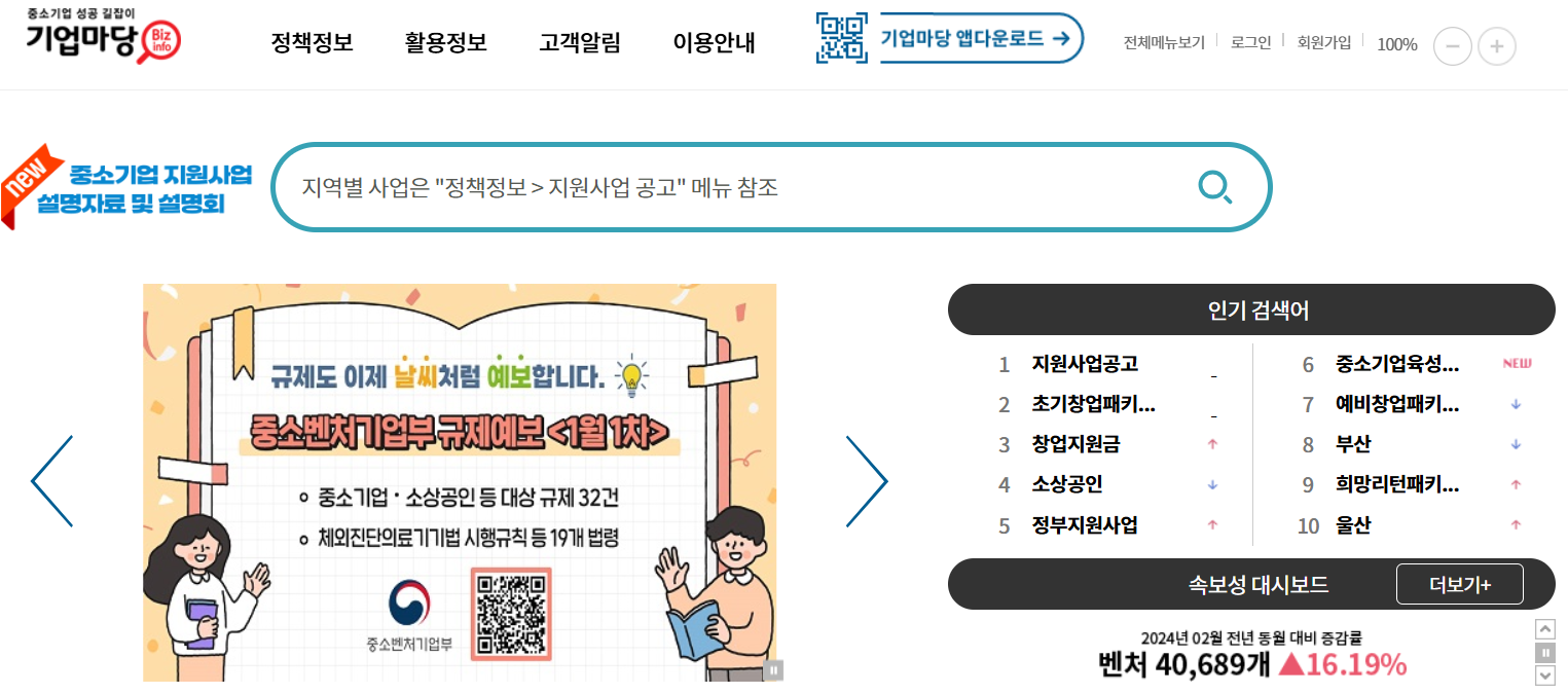 - 서비스: 중소벤처기업 지원사업의 전체 리스트 확인, 지역별·업종별 맞춤형 지원 정보 제공.