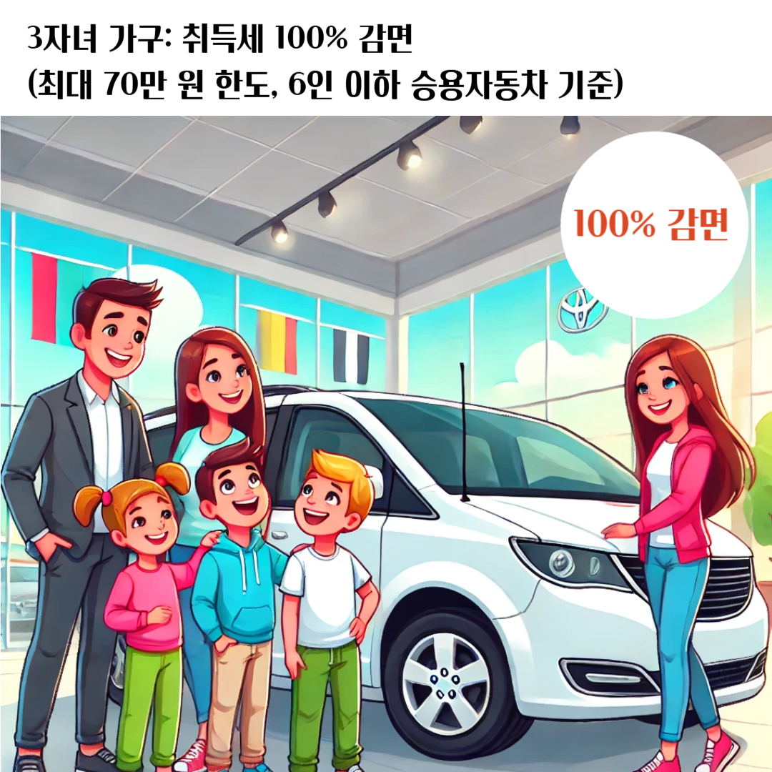- 3자녀 가구: 취득세 100% 감면 (최대 140만 원 한도, 6인 이하 승용자동차 기준)