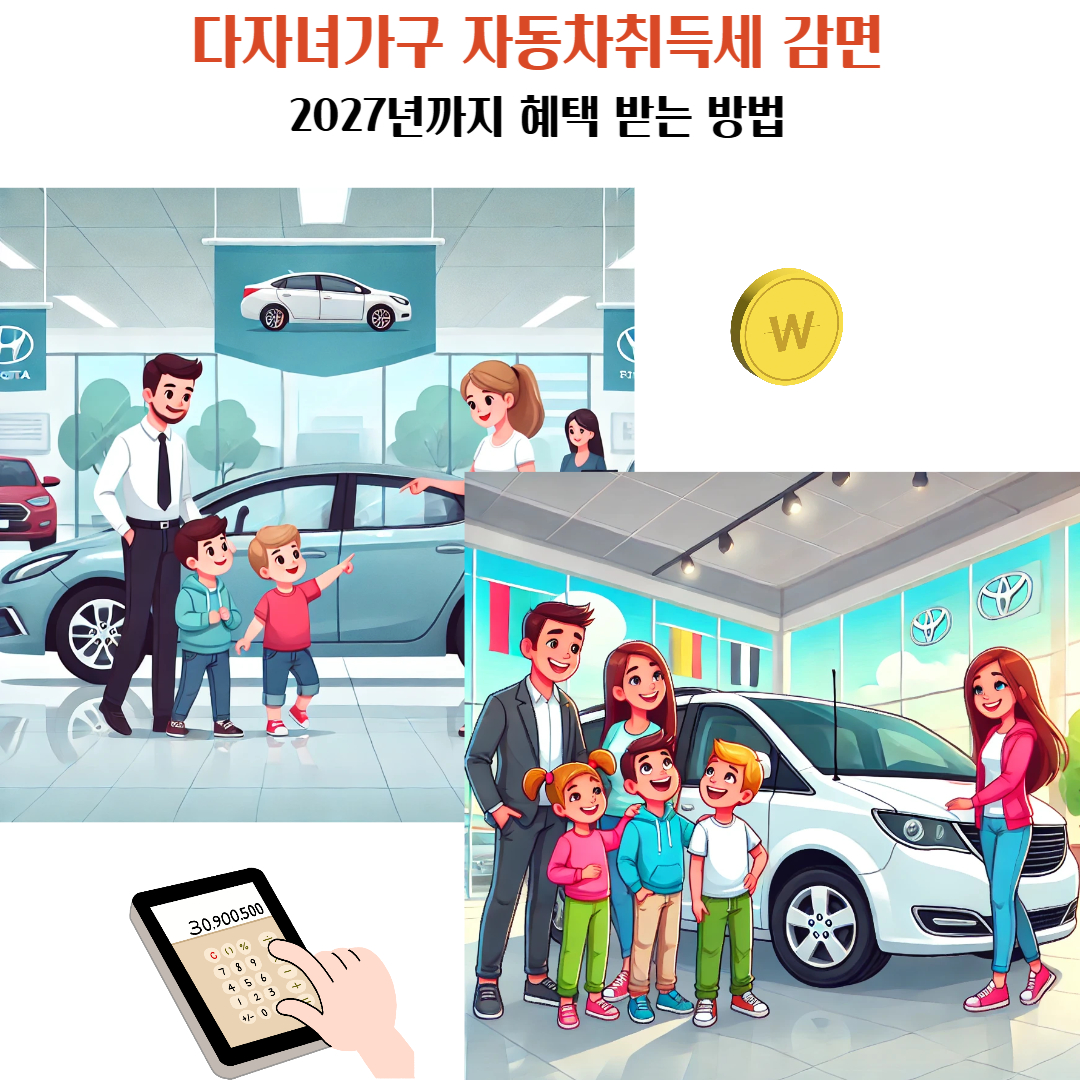 다자녀가구를 대상으로 자동차 취득세 감면 혜택이 시행되고 있습니다. 이 제도는 출산 및 양육을 장려하고, 자동차 취득 비용 부담을 줄이기 위해 마련되었습니다. 2027년까지 진행되는 이 혜택을 통해 가계 부담을 줄이고 차량 구입 시 경제적 혜택을 누려보세요.