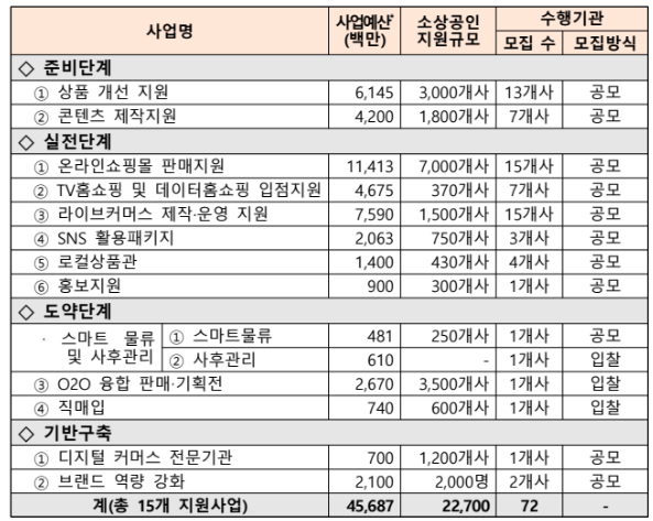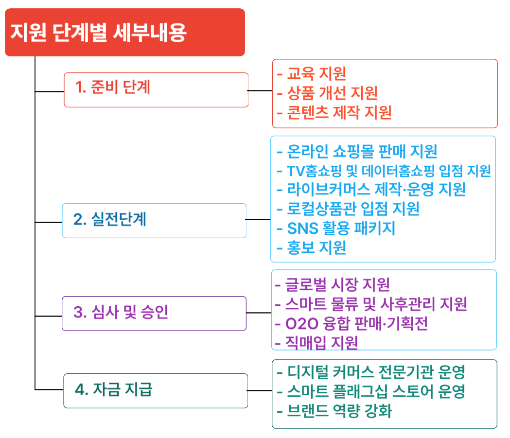 - 상품성 개선 지원, 콘텐츠 제작 지원, 교육 지원, 온라인 쇼핑몰·TV홈쇼핑·라이브커머스·로컬상품관 입점 지원, 글로벌 시장 지원, 스마트 물류, 직매입 등