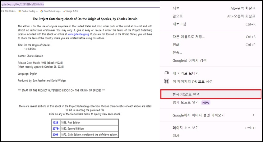 종의 기원 디지털 본을 한국어로 보고 싶으시면 바로가기를 클릭하십시요. 찾아 가신 후 그림과 같이 마우스를 우클릭하여 한국어로 보실 수 있습니다. 종의 기원 디지털 본 바로가기